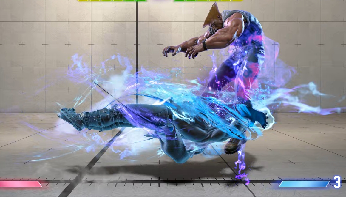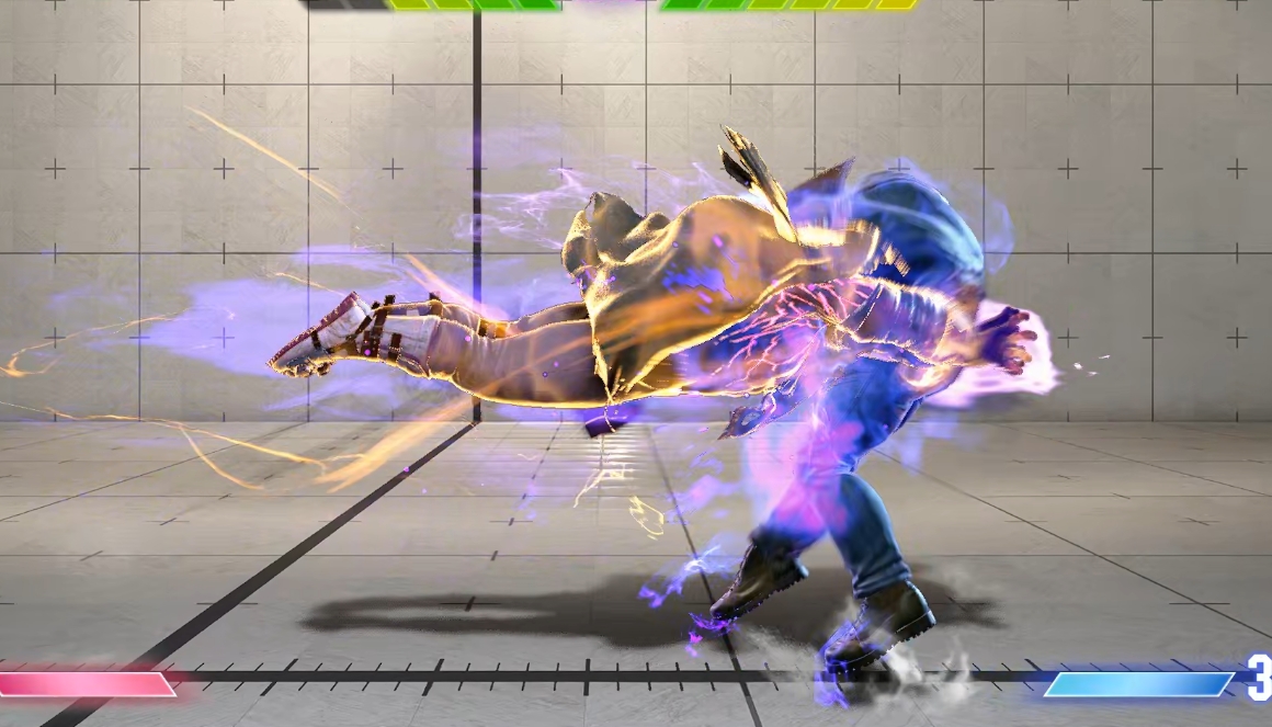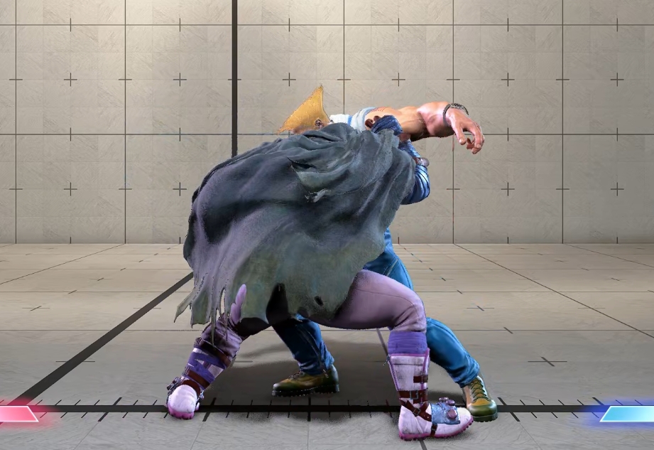 成立時+21F。背負いで叩きつける前投げ。有利フレームが長い上、ベガのDR(ドライブラッシュ)の優秀さのおかげで画面中央で投げても攻めが継続できる偉い投げ。
