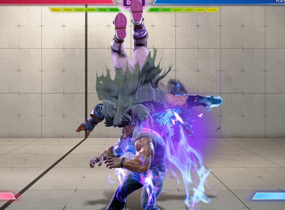 成立時+18F。相手を足で持ち上げたから叩きつけるいつもの後ろ投げ。画面中央では距離が離れるので攻めが継続しにくいが、DRで追いかければ5強Kでジャンプ逃げ防止はできる。
